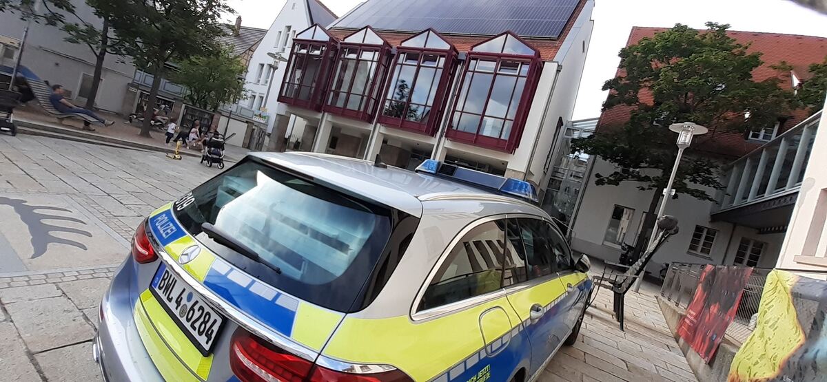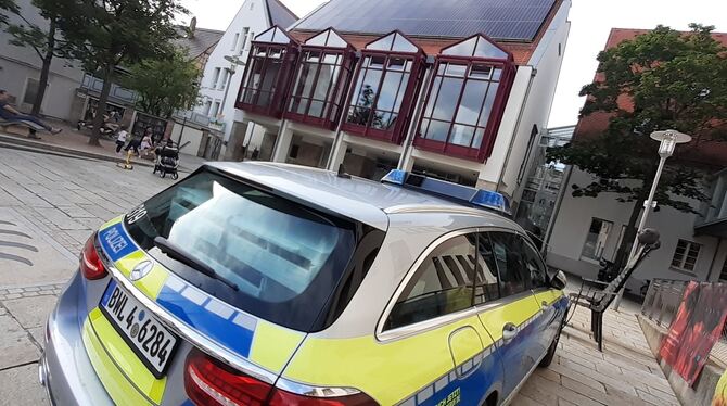 Ein Polizeiauto steht auf dem Metzinger Rathausvorplatz.
