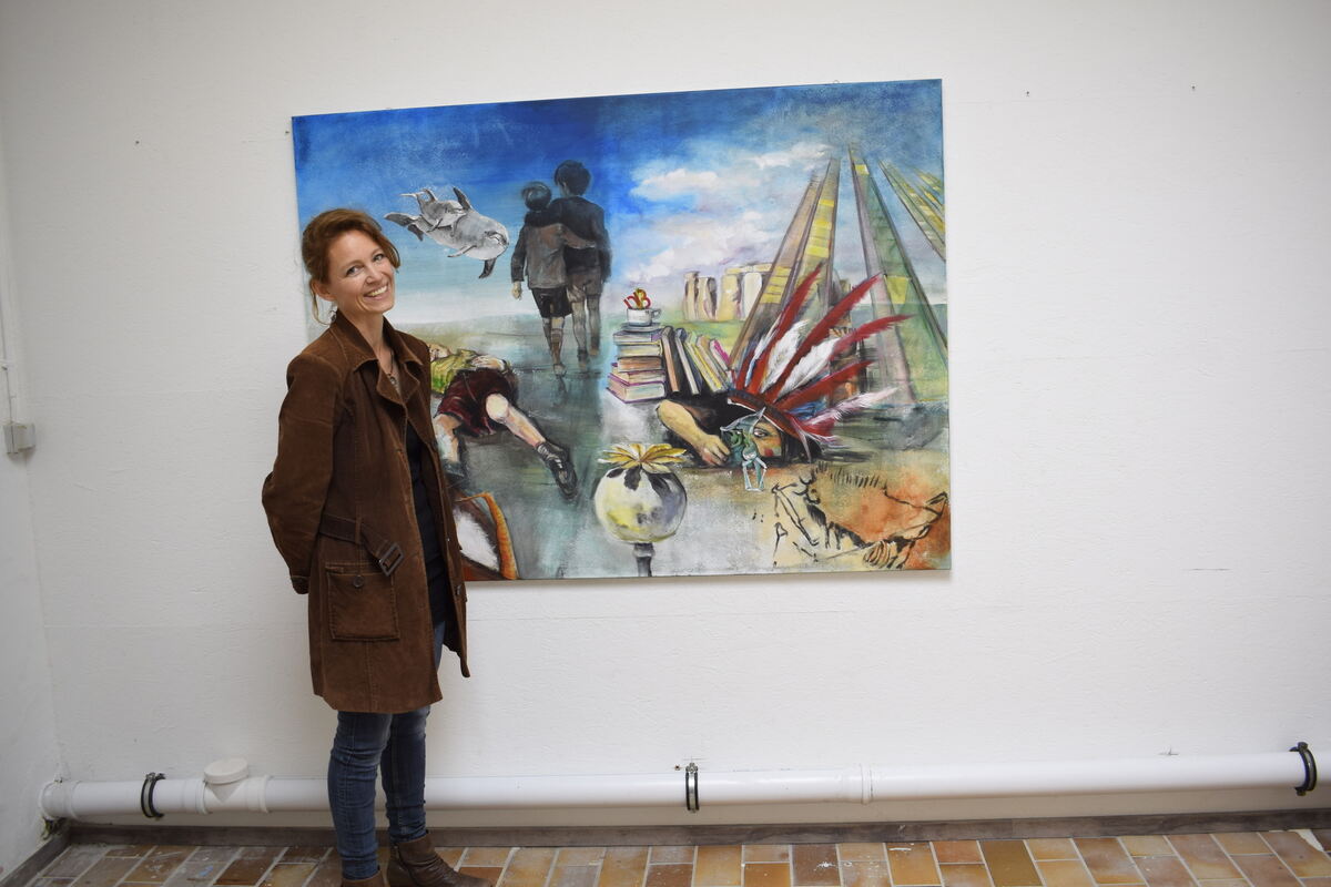 Diana Barth vor einem ihrer Bilder, die dem Symbolismus zuzurechnen sind: Die zweifache Mutter ist Malerin, Mesnerin, Postzustellerin und betreibt in Glems in den Räumen des früheren Malergeschäfts ihres Vaters gleich unterhalb des Obstbaumuseums die Werkstatt-Ateliers. FOTOS: FÜSSEL
