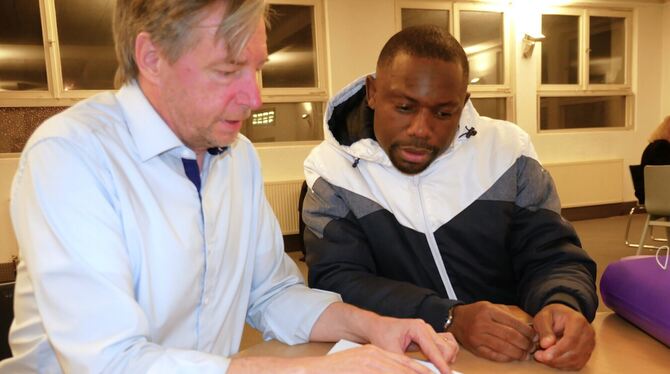 David Roth (links) ist die »gute Seele« beim AK Asyl in Metzingen, hier berät er Patrick Ngatchou Bessala über das »Chancenauftenthaltsrecht«. FOTOS: LEISTER