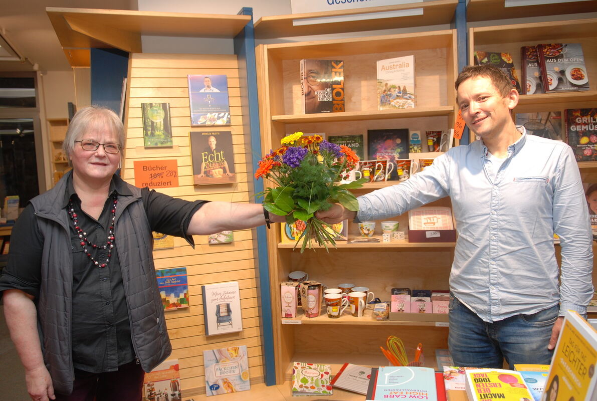 Blumen zum Abschied: Stefan Fink übernimmt die Buchhandlung von Inhaberin Margret Widmann. FOTO: PFISTERER