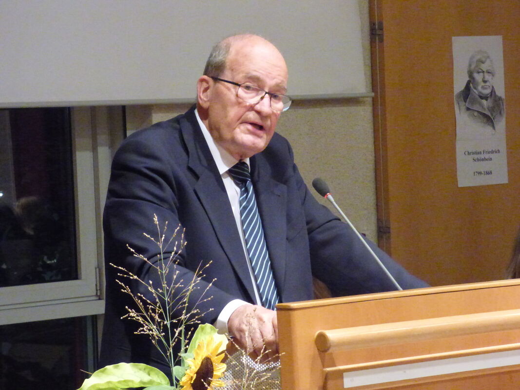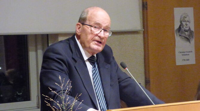 Der Schönbein-Nachkomme Dr. Ulf Bossel erinnerte im großen Saal des Metzinger Rathauses an den Entdecker des Ozons Christian Friedrich Schönbein aus Metzingen, der rechts im Bildhintergrund zu sehen ist. FOTO: BÖRNER