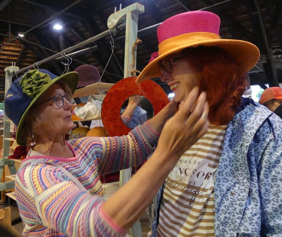 Schick, schick, die form- und farbvollendeten Hüte von Andrea Conradi (links), die hier bei einer Kundin Maß nimmt. FOTOS: SANDER
