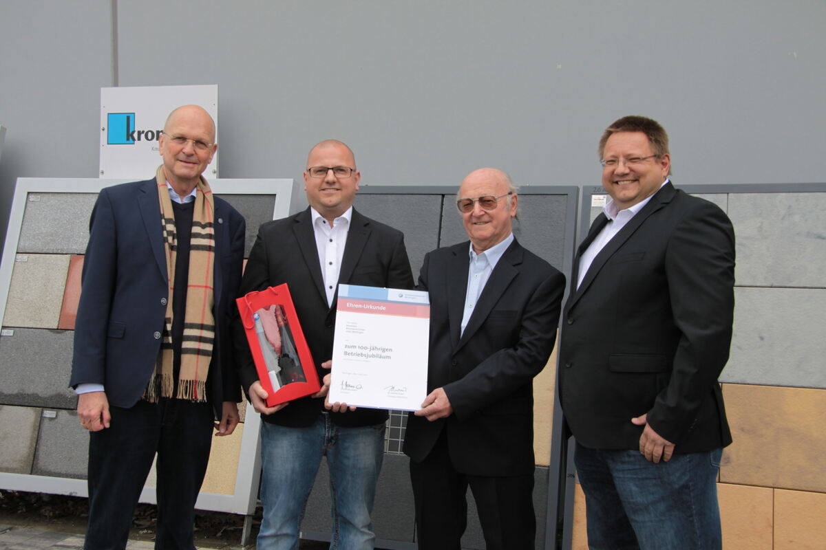 Das Unternehmen Rümmelin Baustoffe mit Hauptsitz in Metzingen-Neuhausen feiert 2022 sein 100-jähriges Bestehen, vor Ort überreicht (von links) Dr. Joachim Eisert, Hauptgeschäftsführer der Handwerkskammer Reutlingen, in der Baustoffausstellung im Freien den drei Geschäftsführern Rene Rümmelin, Dietmar Rümmelin und Andreas Rümmelin die Urkunde zum Betriebsjubiläum.
