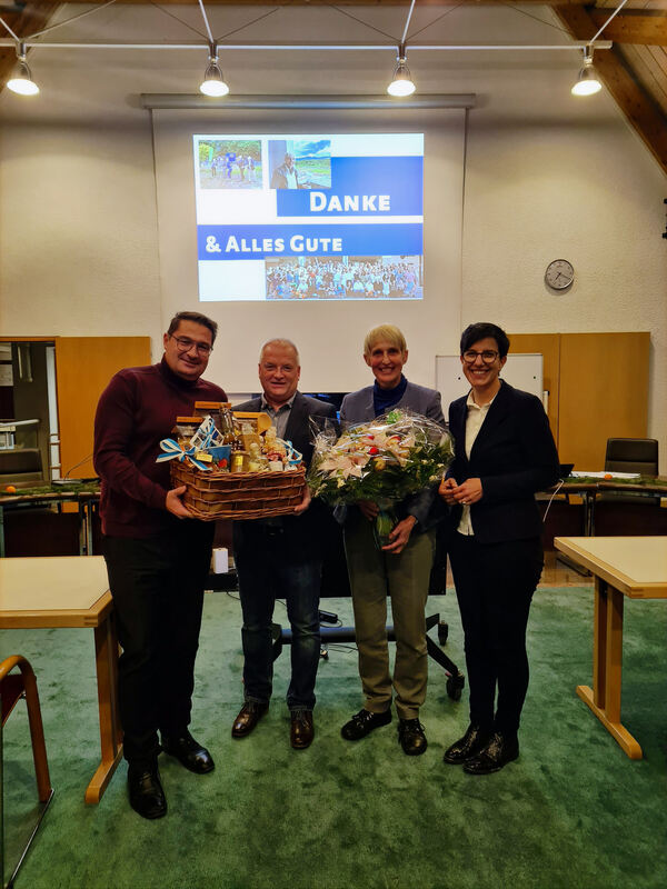 Verabschiedung von Jacqueline Lohde, Erste Bürgermeisterin von Metzingen. Im Bild (von links): Bürgermeister Patrick Hubertz, FWV-Gemeinderat Stefan Köhler, Jacqueline Lohde und Oberbürgermeisterin Carmen Haberstroh.