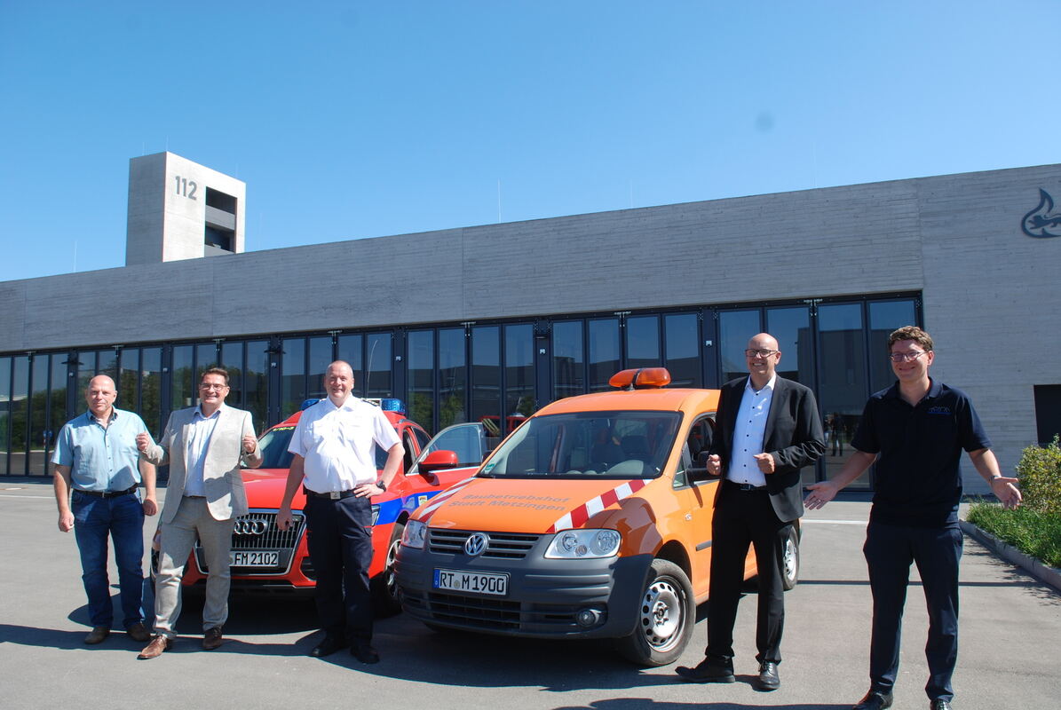 Das neue Zentrum für Feuerwehr und Bauhof Metzingen im Gebiet Braike-Wangen kurz vor der Eröffnung. Über die Fertigstellung und den Bezug freuen sich (von links) Ordnungsamtsleiter Albrecht Gaiser, Erster Bürgermeister Patrick Hubertz, Feuerwehrkommandant Hartmut Holder, Baubürgermeister Markus Haas und Thomas Burnikel vom Amt für Finanzen und Betriebe
