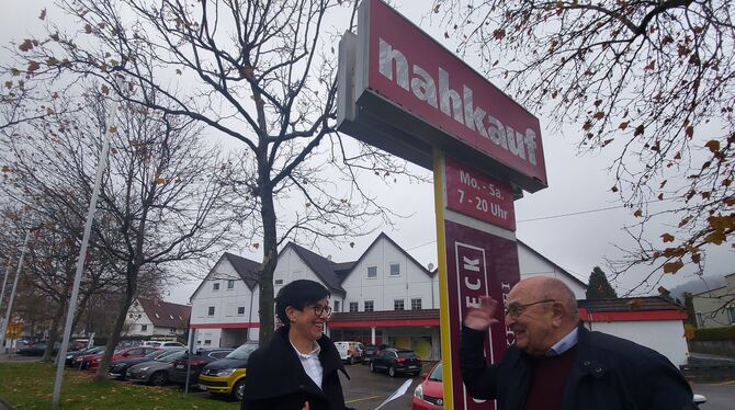 Strahlende Gesichter Anfang Dezember 2022: Metzingens Oberbürgermeisterin Carmen Haberstroh und der Neuhäuser Ortsvorsteher Günter Hau sind glücklich darüber, dass die Stadt das Nahkauf-Areal in der Neuhäuser Ortsmitte erworben hat. ARCHIVFOTO: FINK