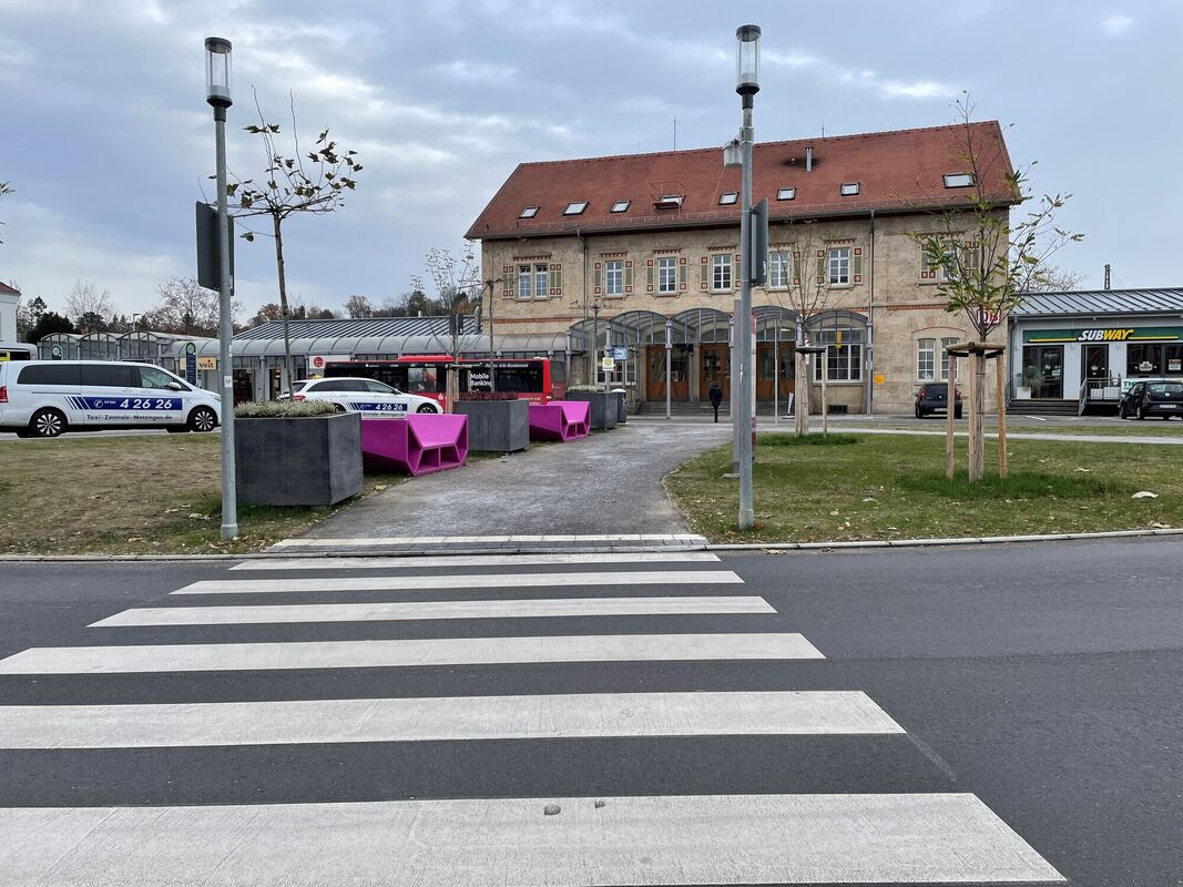 Ein neuer Zebrastreifen führt von der Kreissparkasse zum Metzinger Bahnhof. Doch der Vorplatz ist großteils Brache oder in die Jahre gekommen.