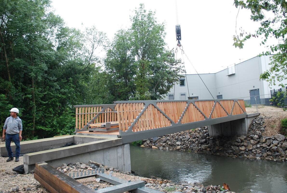 Hier noch am Kranhaken: die neue Brücke für Fußgänger und Radfahrer. Hinten das Kaufland, vor dem Bauarbeiter schließt der Adlergarten an. FOTO: PFISTERER