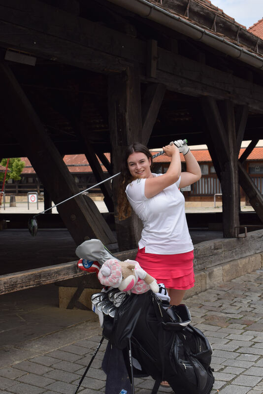 Die 17-jährige Alina-Sophie Koch versucht sich für das Foto mal abseits des Golfplatzes. Ein solcher Abschlag gelingt auch auf dem Kelternplatz mitten in Metzingen. Ihr Glücksbringer Erna – das bunte Kuscheltier auf ihrer Golftasche – hat ihr bislang jedenfalls viel Erfolg beschert. FOTO: RITTGEROTH