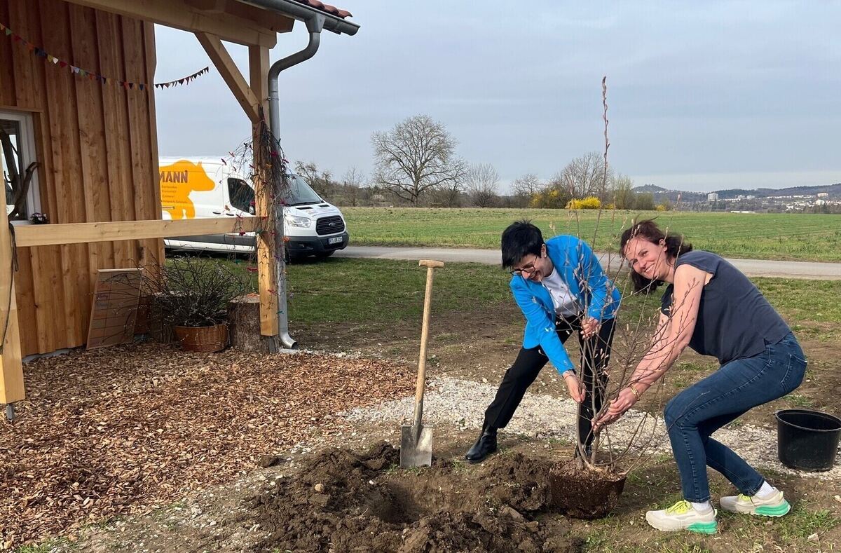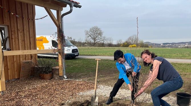 METZINGEN. Neue Schutzhütte für den Metzinger Naturkindergarten »Grashüpfer« am Standort Markwasen. Gemeinsam mit der Vorsitzenden des Trägervereins, Jasmin Triebkorn, pflanzte Oberbürgermeisterin Carmen Haberstroh jetzt symbolisch einen Baum zur Einweihung. Die neue Schutzhütte ist jetzt damit offiziell in Betrieb genommen – mit regulären Betreuungszeiten von 8 bis 14 Uhr.