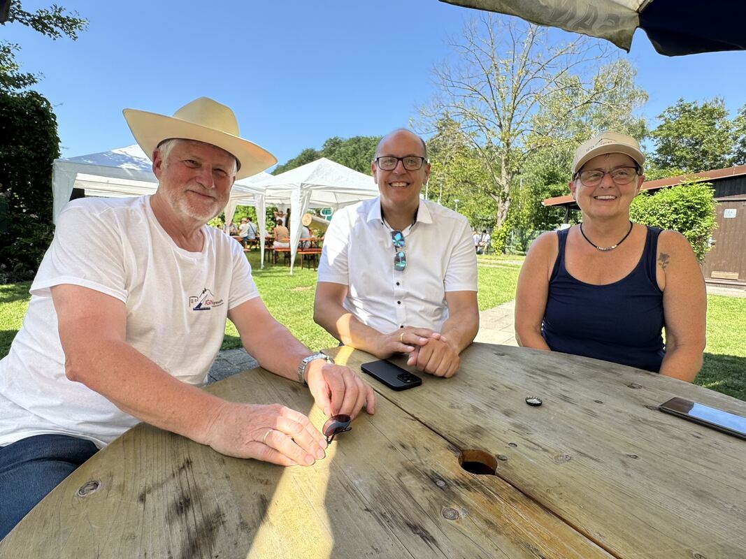 Bernhard Lutz (links) und Heike Richter-Philipp von der IG Neugreuth mit Metzingens Bürgermeister Markus Haas beim Jubiläum auf dem Gelände der Gartenfreunde Lindenbach.