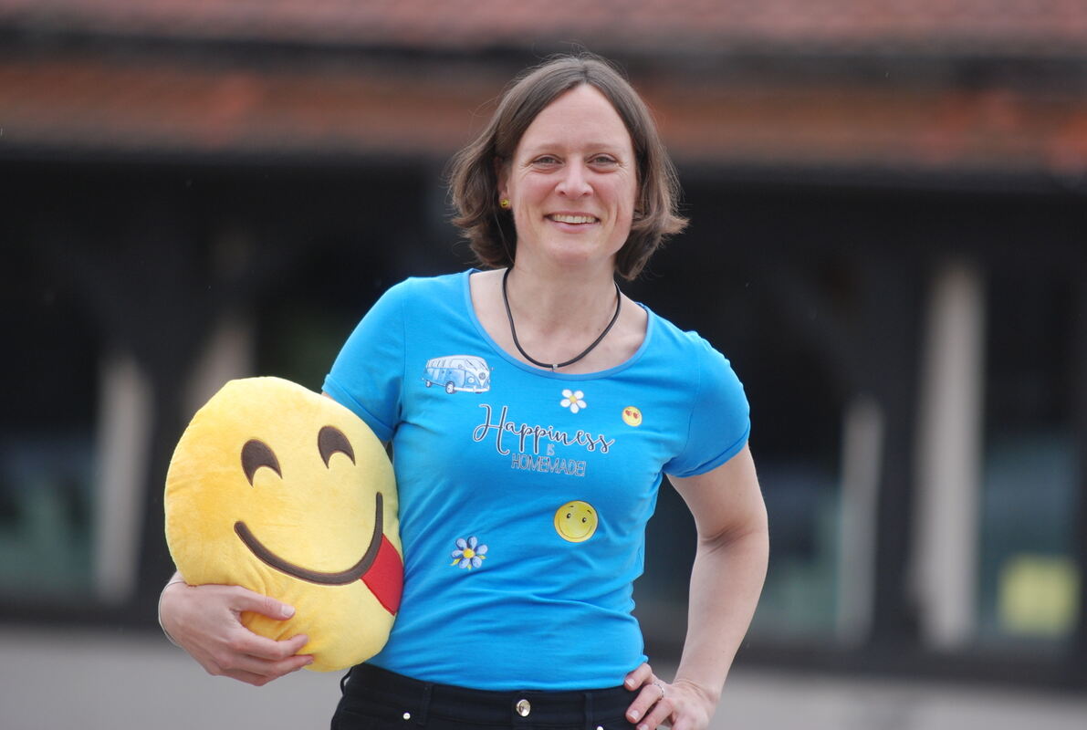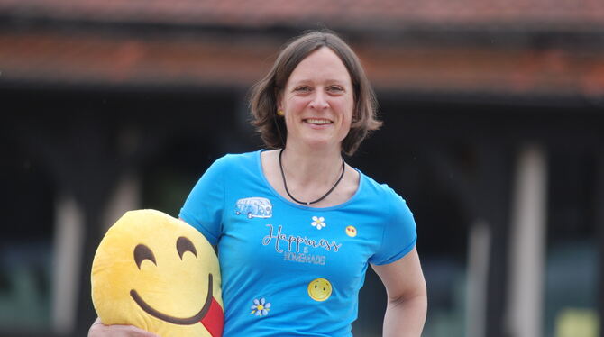 Die Neuhäuserin Silvia Bauer leitet »Lachen online«, steht fürs Bild aber ganz real auf dem Metzinger Kelternplatz. Ihr riesiger Kissen-Smiley hängt während der virtuellen Lachmeetings wie ein Mottomond hinter ihr an der Wand. FOTO: PFISTERER