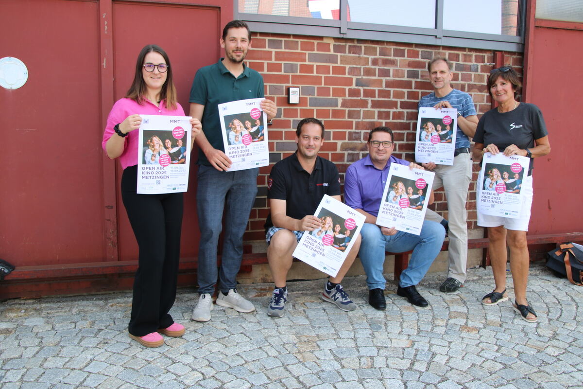 Neue Location, bewärtes Prinzip beim Open Air Kino: Die Veranstaltung zieht vom Bauhof in die Motworworld Village Metzingen um. Es freuen sich auf die Premiere: (von links) die MMT-Mitarbeitenden Marie Kreißig und Maximilian Vohl, Motorworld-Standortleiter Clemens Fritz, MMT-Geschäftsführer Patrick Hubertz, Thorsten Hail vom Stadtjugendring Bad Urach und Petra Feucht von der Skizunft.