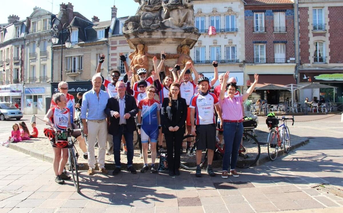 Die Ankunft in Noyon erfolgte gleichzeitig mit dem Eintreffen der neunköpfigen Radlergruppe, geleitet von Eberhard Fiala. Sie war am Sonntag zuvor in Metzingen gestartet und hatte die lange Strecke mit Muskelkraft, viel Schweiß und einem grandiosen Teamgeist zurückgelegt. Radfreunde aus Noyon fuhren ihnen entgegen und gemeinsam wurden sie alle auf dem Rathausplatz von Bürgermeisterin Sandrine Dauchelle in Empfang genommen. Anschließend wurden die Gäste in Gastfamilien untergebracht.