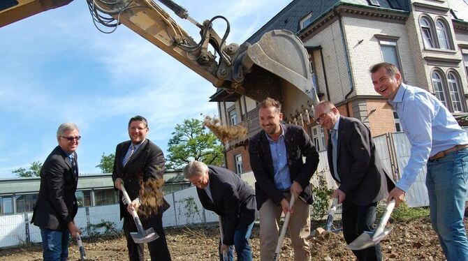 Spaten stechen (von links) CDU-Stadtrat Holger Weiblen, OB Dr. Ulrich Fiedler, Architekt Manfred Hagelstein, Immowerk-Geschäftsführer Damir Smoljan, sein Kompagnon Tobias Krampulz (rechts) und Bürgermeister Dietmar Bez. Im Hintergrund die Völter-Villa.