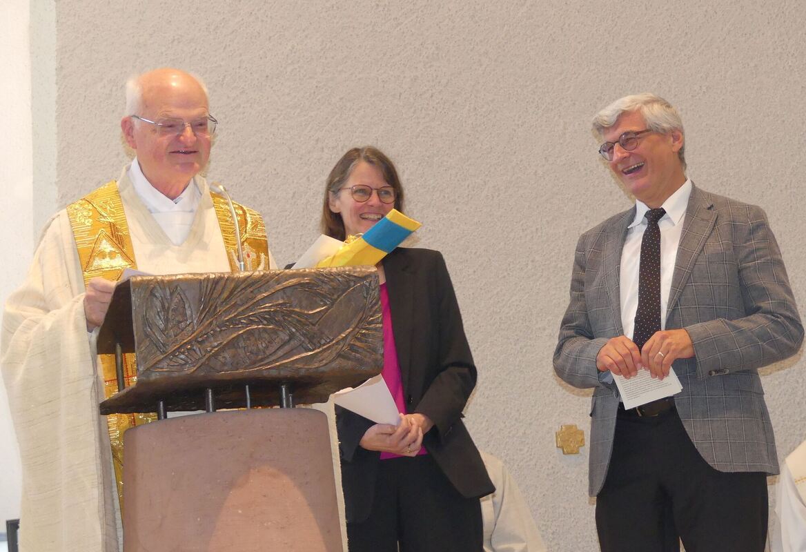 Pfarrer Hermann Weiß outet sich bei seiner Verabschiedung als VfB-Fan und entscheidet sich deshalb für einen Spielbesuch und nicht für einen Rundflug mit dem Motorsegler über die alte und neue Heimat Bad Mergentheim. Mit ihm im Bild die katholische Pastoralreferentin Barbara Schmitt-Feuchter und Weiß’ evangelischer Kollege Albrecht Schäfer. FOTO: SANDER
