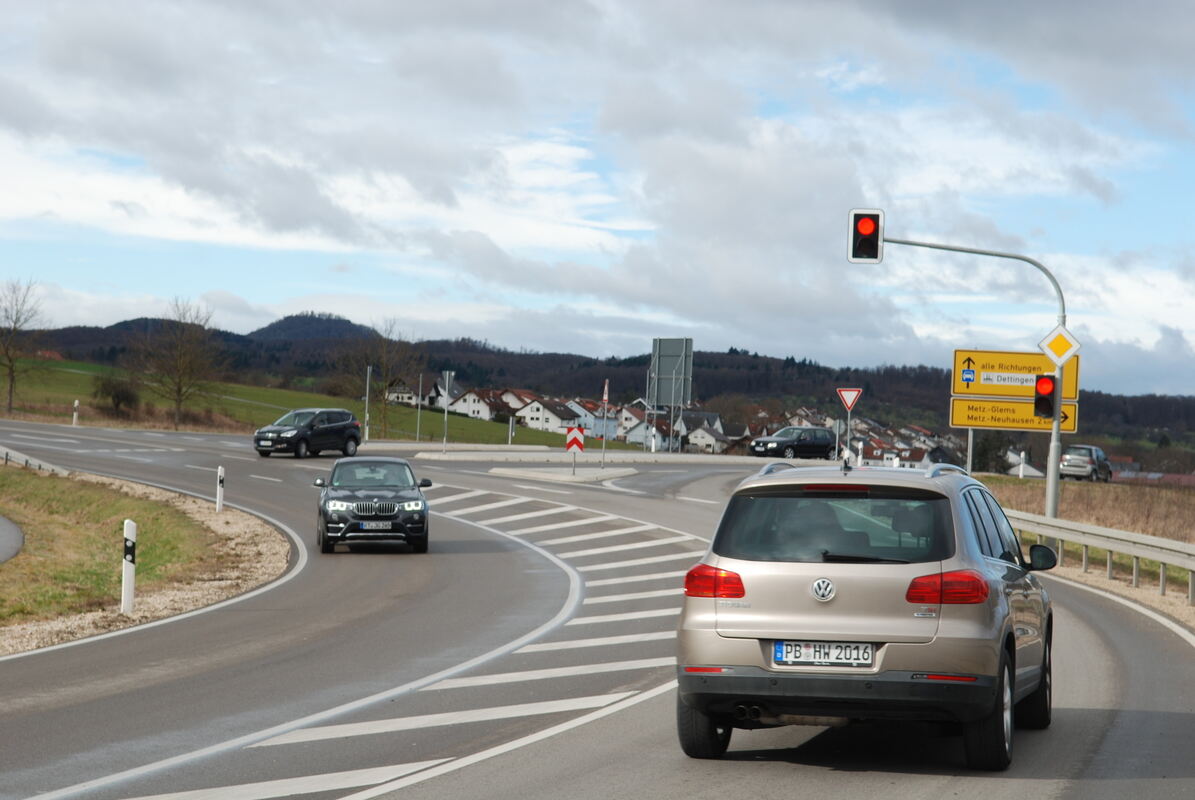 Sogenannte Lücken-Ampeln mit Gelb- und Rotlicht auf der bevorrechtigten L 380 a sollen in der unfallträchtigen Schlössleskurve die Verkehrslage sicherer machen. Sie schalten auf Rot, wenn Fahrzeuge aus Richtung Neuhausen (Mitte), die die Vorfahrt achten müssen, eine knappe Minute auf Einfahrt in die Kurve gewartet haben. Die Einmündung liegt auf einer leicht kuppenartigen Anhöhe, die Kurve ist schräg überhöht. Autofahrer aus Richtung Neuhausen haben bisher keine Ampel. Das könnte sich ändern. FOTOS: PFISTERER