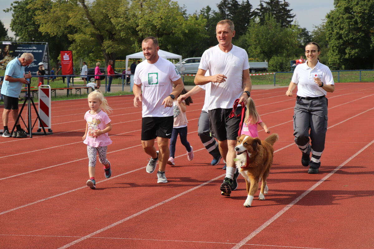 Nicht nur Menschen sind beim Spendenlauf »Laufend Gutes tun« im Otto-Dipper-Stadion in Metzingen gestartet. Dieser Hund war auch dabei. FOTOS: BLOCHING