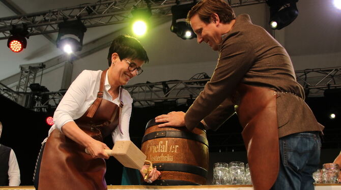 Vor drei Jahren war's ihre Premiere. Oberbürgermeisterin Carmen Haberstroh 2022 beim Fassanstich zum Stadt- und Heimatfest.