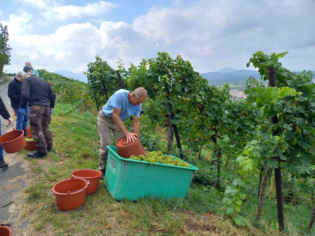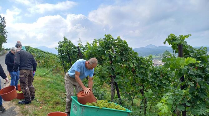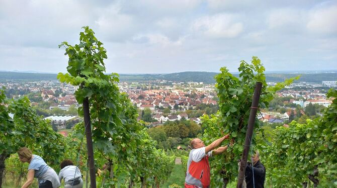 Mit Blick auf die Stadt Metzingen: Helfer bei der Weinlese.