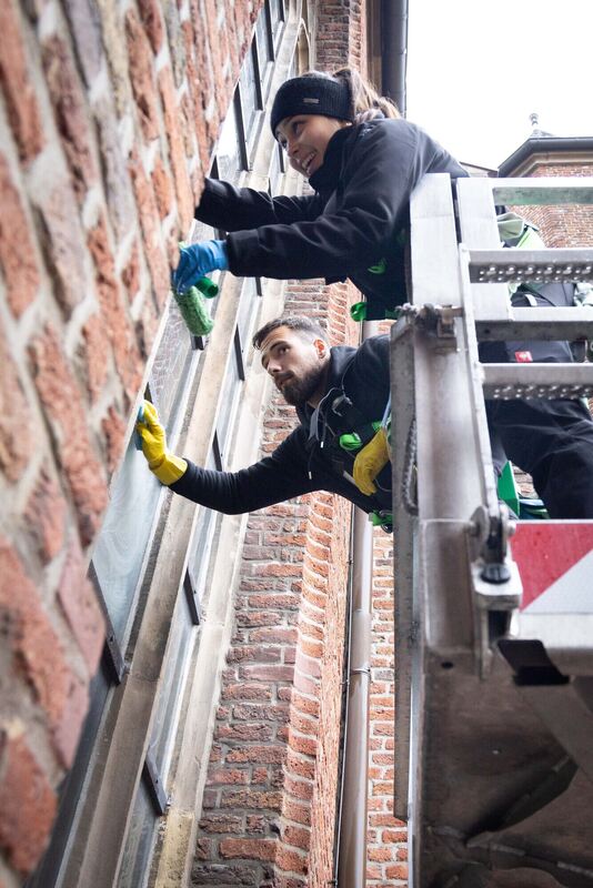Eine ziemliche Herausforderung, die Basilika St. Lambertus in Düsseldorf »aufzuhübschen«. Mit dem Hubsteiger ging’s in luftige Höhen. Sarah Lutz und Dennis Winkler, der Landessieger von Bayern, hatten sichtlich Spaß. FOTO: BIV