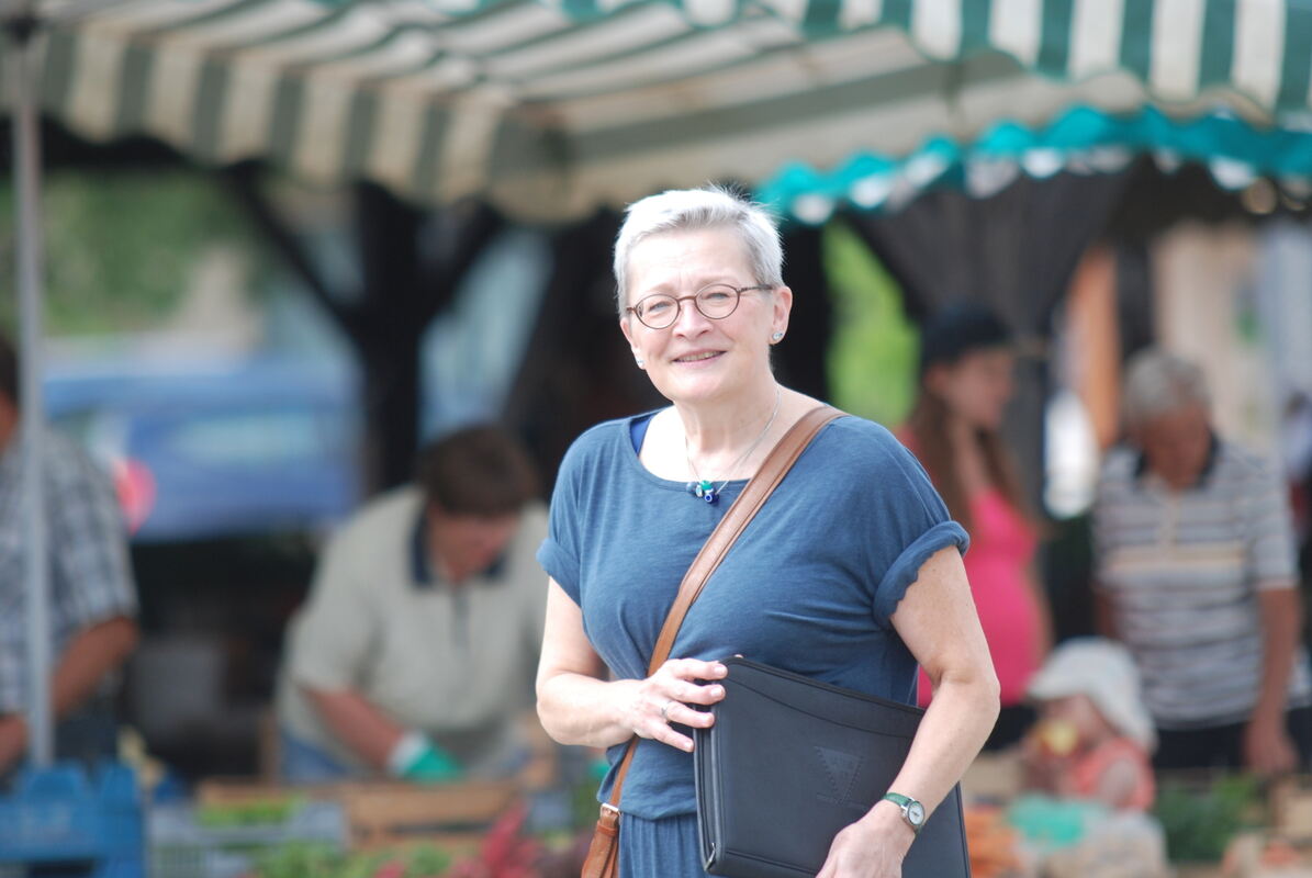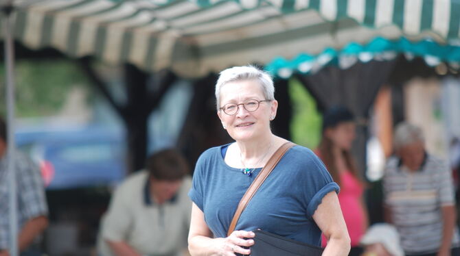 Jeanette Rzyski-Knab auf dem Metzinger Wochenmarkt, wo viele Schwäbisch sprechen.