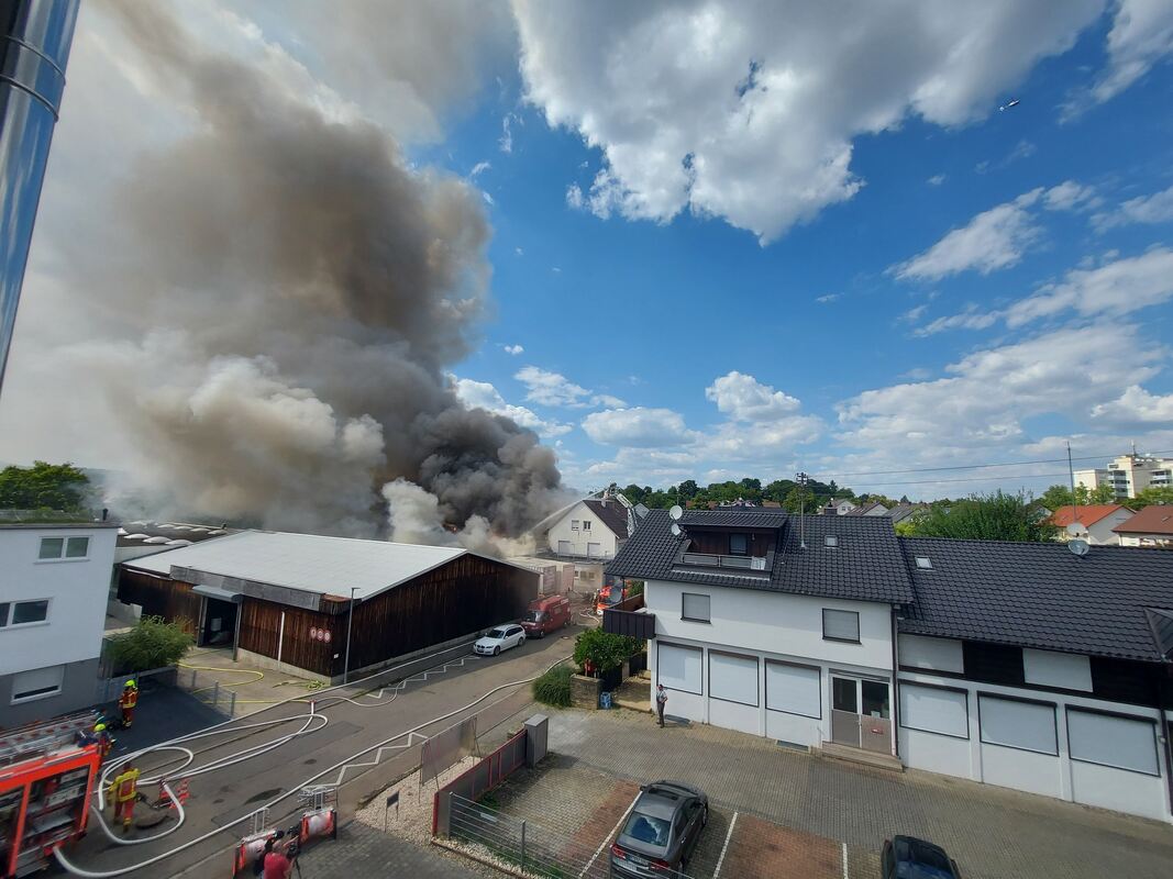Über der Stadt stand eine hohe, schwarze Rauchsäule, die kilometerweit zu sehen war. Über die Warn-App NINA und den Rundfunk wurde die Bevölkerung gebeten, Fenster und Türen aufgrund der starken Rauchentwicklung geschlossen zu halten. Die nächstliegenden Gebäude hatte die Feuerwehr evakuiert. Über die Beschaffenheit des Rauchs konnte Einsatzleiter Andreas Merz am frühen Abend noch nichts sagen. Eine Messeinheit des Landkreises war vor Ort, über der Brandstelle kreiste eine Drohne der Bosch-Werksfeuerwehr. Auch die Metzinger Kläranlage wurde alarmiert, um sich auf das schaumhaltige Löschwasser vorzubereiten.