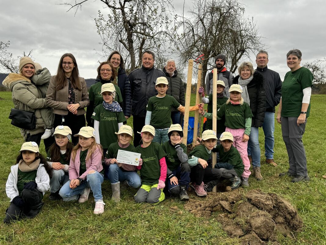 Minigärtner von der Metzinger Siebenkeltern-Schule pflanzen Apfelbaum