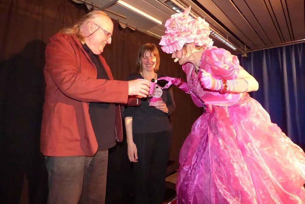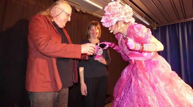 Thomas Zecher, seine Frau Petra (die das geschenkte Herz in der Hand hält) und die Moderatorin des Abends, Marlies Blume, die gemeinsam auf die Eröffnung der Medien Akademie Metzingen anstoßen. FOTO: PR