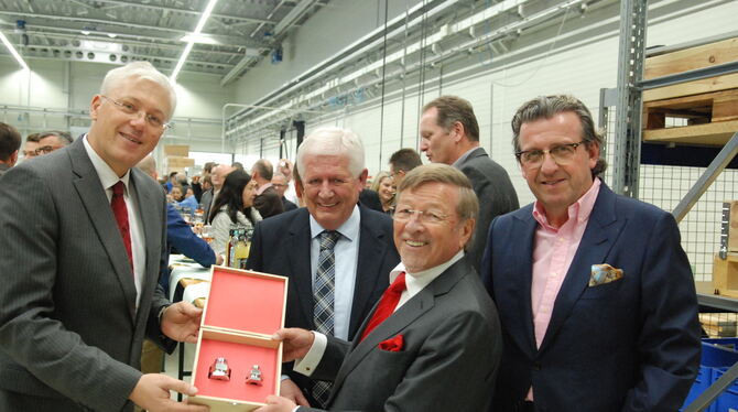 Walter H. Lechler (Zweiter von rechts) bekommt von Mitgeschäftsführer Guido Kunzmann nachgebaute Düsenringe. In der Mitte Dieter Hauswirth, Vorstand der Lechler-Stiftung und Metzingens Ex-OB, rechts Stefan Wolf, Vorstandschef von Elring Klinger. FOTO: PFISTERER