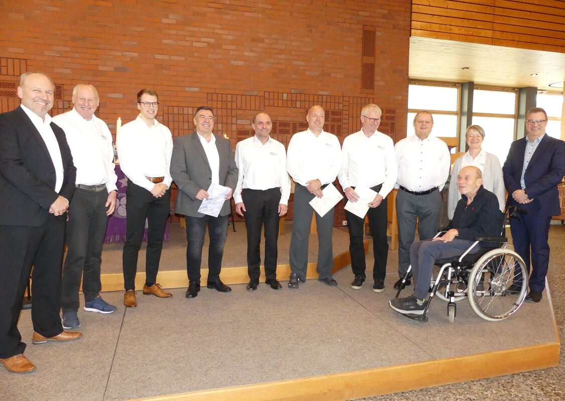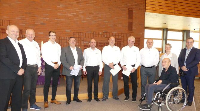 Bezirksposaunenwart Peter Mayer (rechts) ehrte langjährige Bläser vom Posaunenchor Neuhausen in der Zwölf-Apostelkirche. Nicht alle waren dabei. FOTO: SANDER