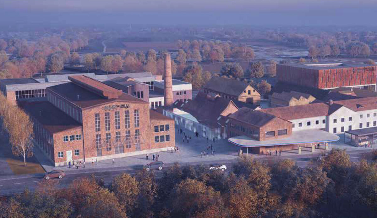 Das Gelände der Motorworld, so wie es mal aussehen soll: Links ist die große Schmiede-halle zu sehen, die für Events mit bis zu 2 300 Personen geeignet ist. Rechts daneben, gleich vorne an der Auchtertstraße, ist der American-Diner geplant. Dahinter (am rechten Bildrand) könnte noch ein Hotel entstehen. Dazwischen weitere Gastronomie, Manufakturen und Werkstätten. Alles unter dem Motto: Mobile Leidenschaft. DARSTELLUNG:MOTORWORLD