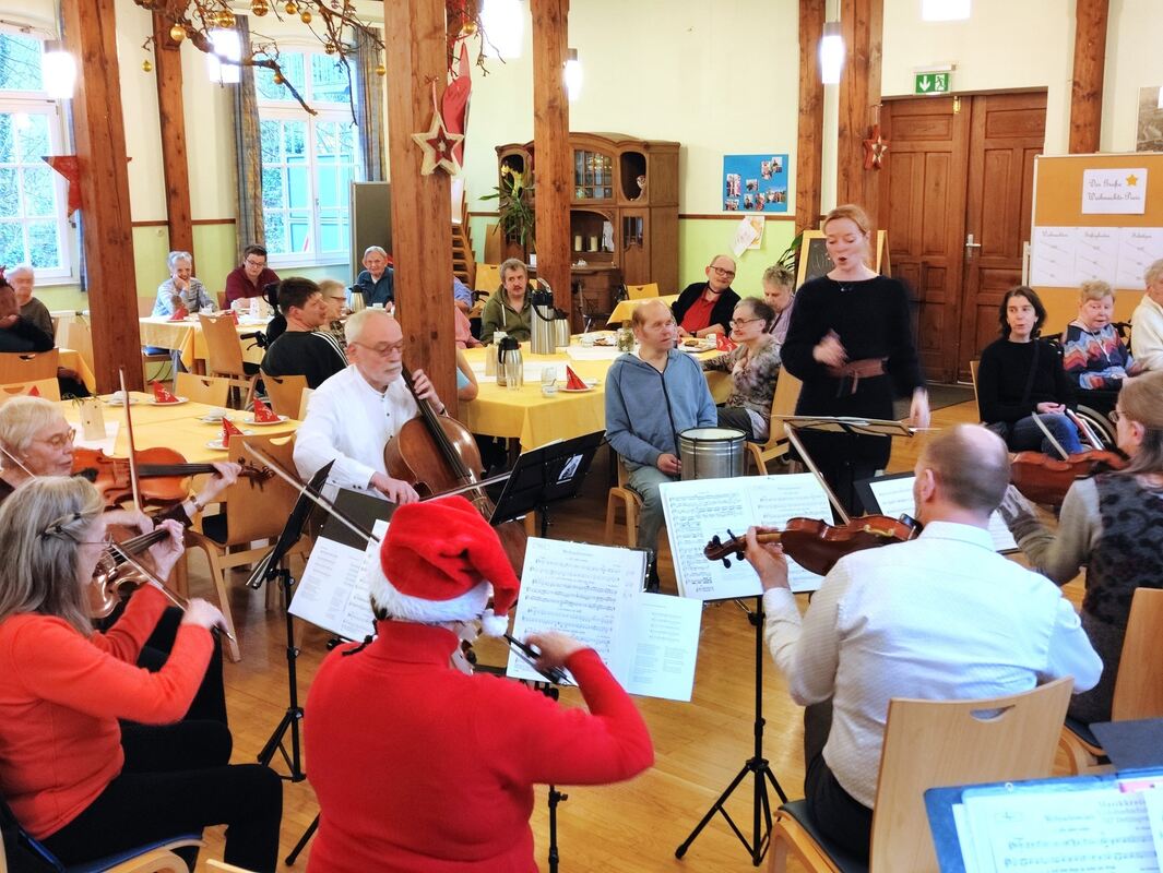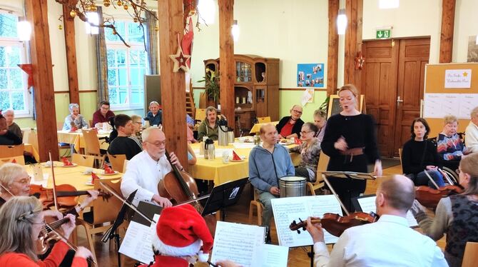 DETTINGEN. Schwungvolle Musical-Klänge brachte das VHS-Orchester Dettingen zur Adventsfeier der Bruderhausdiakonie in der Schwalbenstadt mit. Melodien aus »My Fair Lady« zauberten heitere Walzerstimmung in den festlich geschmückten Saal. Rund 15 Musiker des Orchesters servierten unter Leitung von Paula Stark Ausschnitte aus dem Herbstkonzert-Programm. Es war wie immer der letzte Auftritt im Jahr für das Orchester. Und wie immer nahmen Bewohner und Angehörige begeistert Anteil am Geschehen. Ein Bewohner verstärkte das Orchester an der kleinen Trommel.