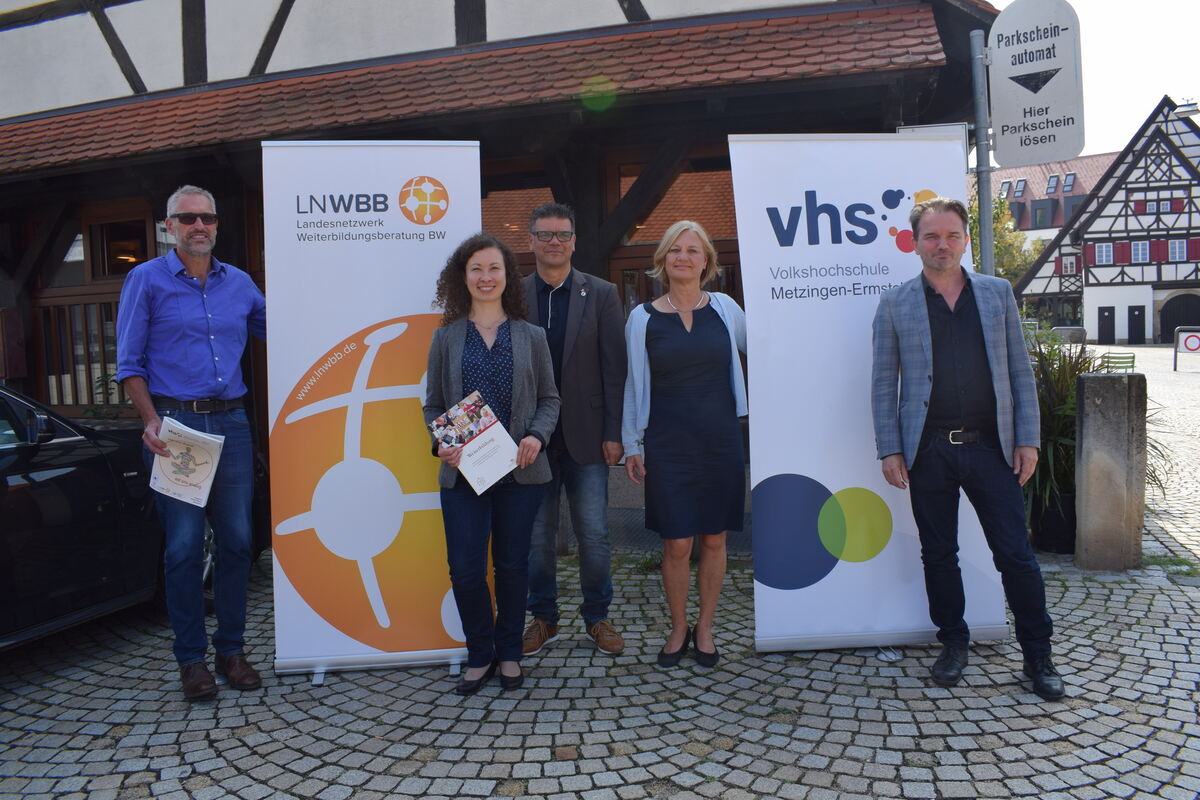 Büchereileiter Ulrich Koch, Victoria Hepting vom Landesnetzwerk Weiterbildungsberatung, die neuen Metzinger Berater Andreas Konitzer und Astrid Dorka-Tiefensee sowie VHS-Geschäftsführer Oliver Beck (von links) stellen das neue Weiterbildungsnetzwerk der Kelternstadt vor. FOTO: BÖRNER