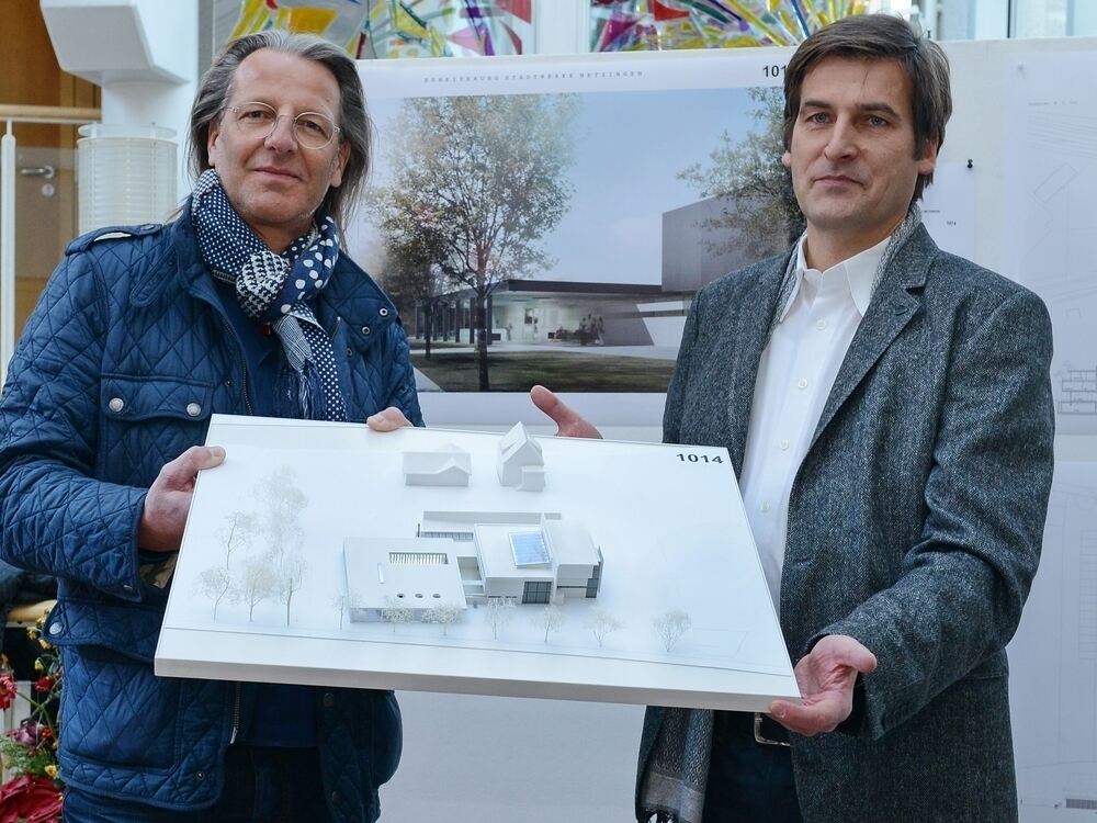 Joachim Daller (rechts) und Jörg Seidenspinner mit Modell und Computeranimation ihres Gewinnerentwurfs für den Stadtwerke-Anbau. Die beiden Architekten aus Stuttgart und Metzingen haben sich erneut zu einer Arbeitsgemeinschaft zusammengetan. GEA-FOTO: USCHI PACHER