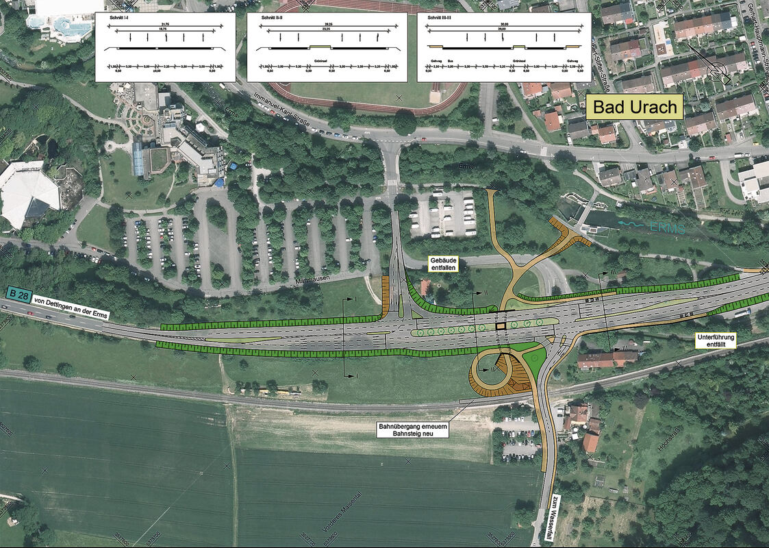 Die Wasserfallkreuzung: Wie man im Plan sieht, soll die Straße in diesem Bereich aufgeweitet werden. Die Straße Richtung Wasserfall (unten) führt wie gehabt in die B 28. Ins Kurgebiet entsteht eine neue Einfahrt (oben links). Über die Bundesstraße ist eine Überführung für Fußgänger und Radfahrer geplant, die hier noch als Unterführung eingezeichnet ist.
