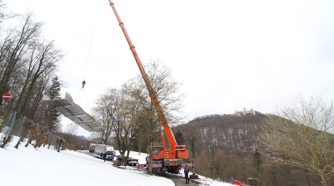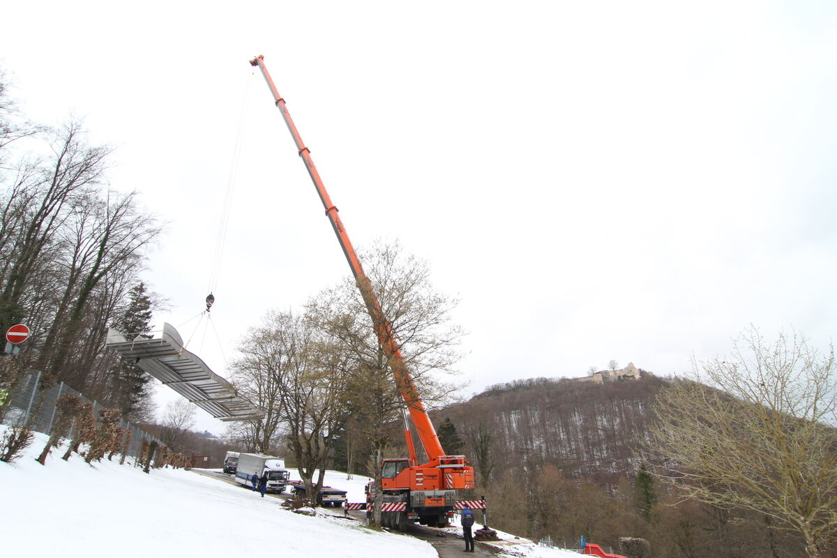 Die Wellenrutsche ist 15 Meter lang und vier Meter breit, und sie wiegt schlappe vier Tonnen. Dafür braucht’s schweres Gerät: Der 120-Tonnen-Autokran einer Reutlinger Spezialfirma kann seinen Arm auf bis zu 52 Meter ausfahren. Im Uracher Höhenfreibad waren immerhin 45 Meter nötig, um die Wellenrutsche um zwei stattliche Bäume herum zu bugsieren.