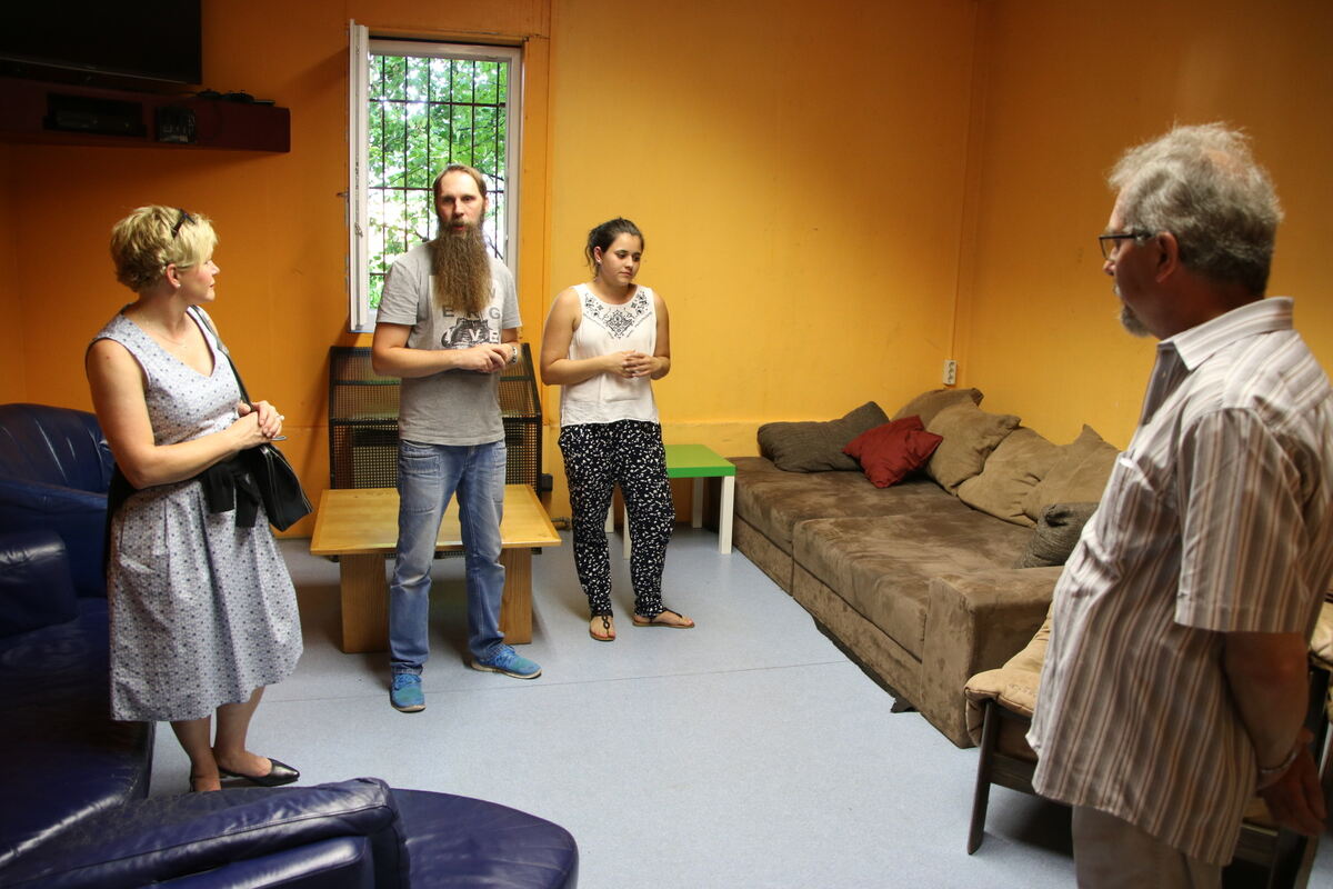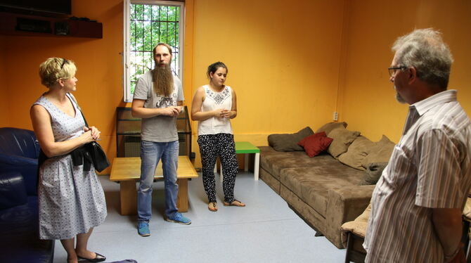 Jugendhaus-Mitarbeiter Fabian Kenner und Christina Zepf (beide in der Mitte) führten Gemeinderäte durch den bisherigen Jugendtreff. FOTO: OECHSNER