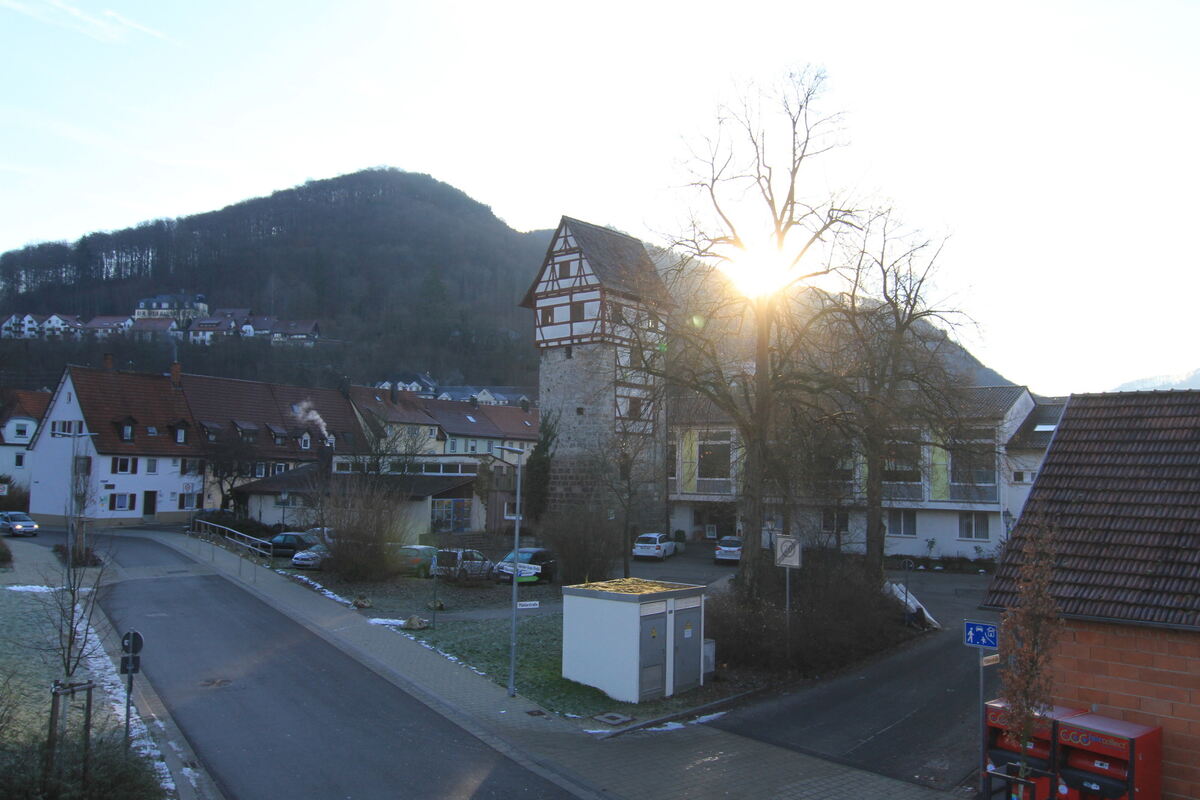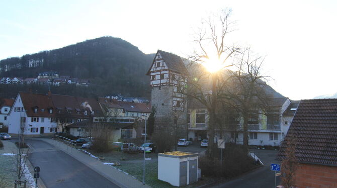 Das Areal um den Uracher Ulrichsturm soll verändert werden. Dazu lobt die Stadt einen kombinierten Architekten-Investoren-Wettbewerb aus. Links vom Ulrichsturm der Kindergarten »Grünes Herz« der Stadt, rechts das Hartenstein-Haus der evangelischen Kirche. FOTO: FINK