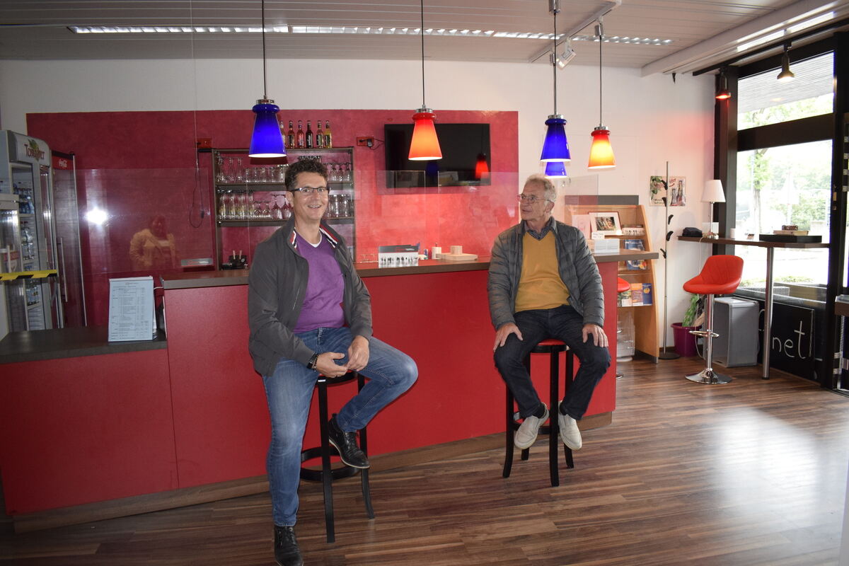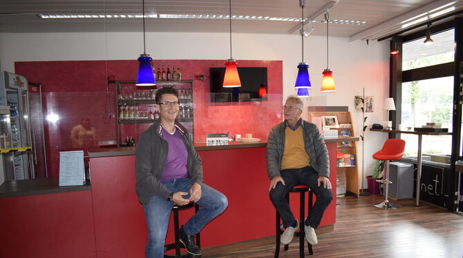 Frank Falter (links) und Harald Hug an der Kultur-Theke: Sie freuen sich nach der coronabedingten Schließung, das Kulturforum in Metzingen wieder öffnen zu dürfen. Wenn auch unter strengen Auflagen. FOTO: FÜSSEL