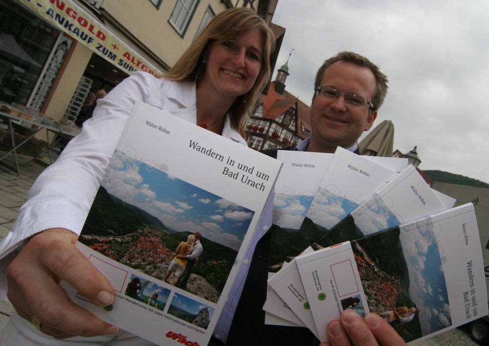 Sylvie Lemnitz-Eppler und Torsten Clement zeigen auf dem Marktplatz den neuen Wanderführer der Stadt Bad Urach.