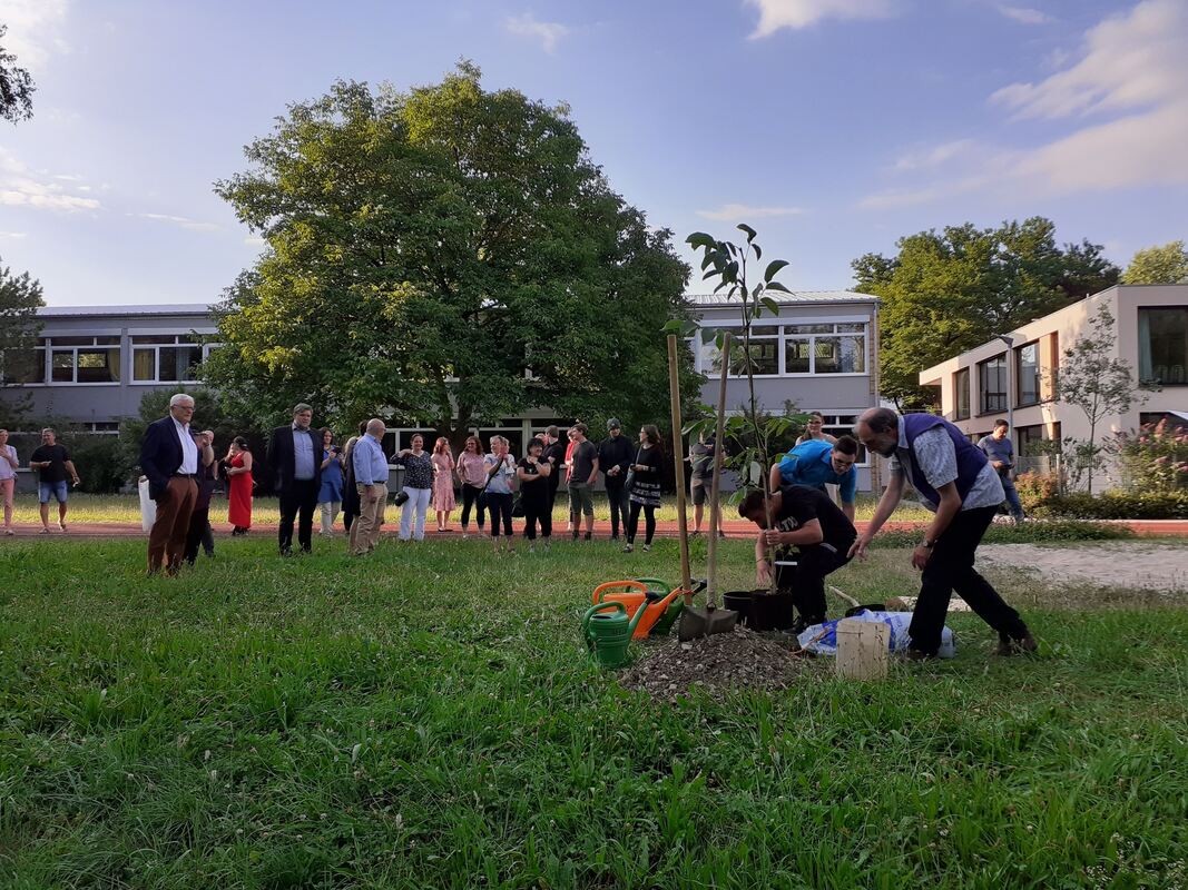 Die vergangenen zwei Jahre hatten die Schüler zusammen mit ihrem Klassenlehrer Manfred Sturm auf diesen Tag hingearbeitet. Durch die Herstellung und den Verkauf von Walnussöl und andere Aktionen konnten sie einen größeren Geldbetrag erwirtschaften, und eigentlich wollten sie damit ihre Abschlussfahrt zum Segeln aufs Ijsselmeer finanzieren. Doch daraus wurde leider nichts. So konnten nun die Gäste der kleinen Feier miterleben, wie die Neuntklässler als Zeichen ihrer Zuversicht einen Walnussbaum auf dem Schulgelände pflanzten.