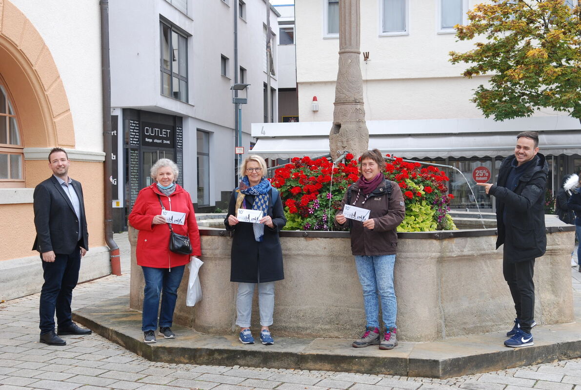 Die Gutscheingewinnerinnen Inge Drescher, Annedorle Stahl und, Malu Boßler (Zweite bis Vierte von links) werden flankiert von Sylvio Flemmig vom Vorstand der CIM (links) und Nicolay Dietrich von der MMT. FOTO: PFISTERER