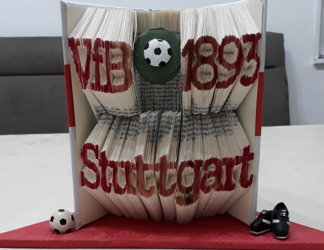 Aber nicht jedes Buch eignet sich für Orimoto. Es muss einen festen Einband (Hardcover) haben. Die Seitenzahl sollte, wie Lembeck erklärt, zwischen 400 und 600 liegen, »je nach Größe des Motivs«. Das Buch mit dem VfB-Logo hat sogar 720 Seiten.
