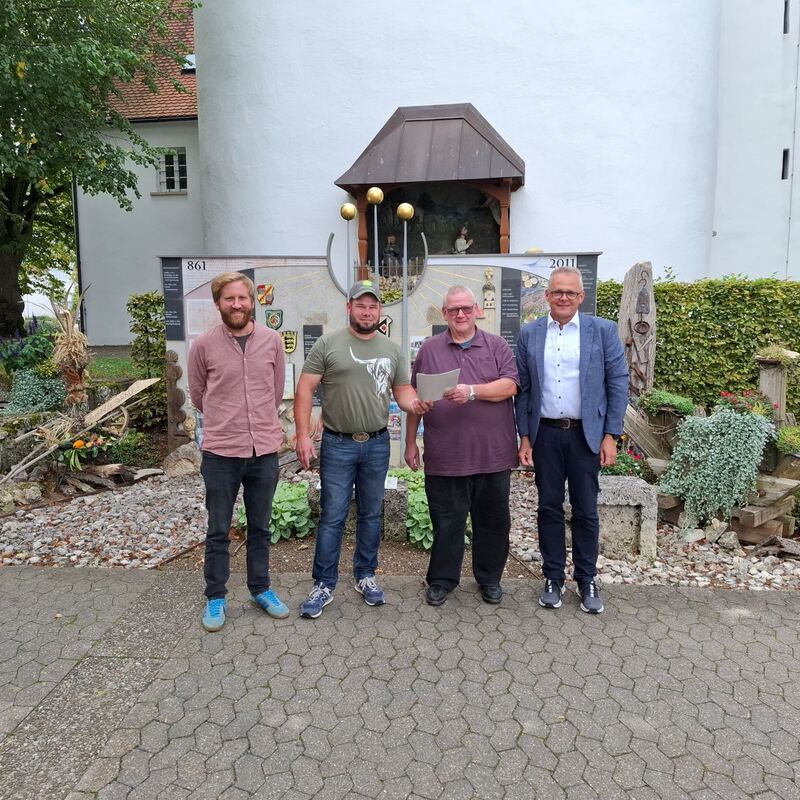 Unterzeichnung des Pachtvertrags (von links nach rechts): Rainer Striebel (Geschäftsstelle Biosphärengebiet Schwäbische Alb), Daniel Armbruster (stellvertretender Vorstand Schlachtgemeinschaft), Georg Baumeister (Vorstand Schlachtgemeinschaft), Bürgermeister Hartmut Walz. FOTO: GEMEINDE WESTERHEIM