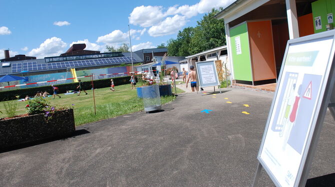 Die Corona-Verordnung Sportstätten definiert Vorgaben zu Höchstgrenzen für die Zahl der Badegäste, die sich gleichzeitig auf dem Freibad-Gelände aufhalten dürfen. Der Freibadbesuch wird von Montag bis Sonntag, aufgeteilt in jeweils zwei Zeitfenster, möglich sein: von 8 bis 12 Uhr (Einlass bis 11.15 Uhr) und von 13 bis 20 Uhr (Einlass bis 19.15 Uhr). Die Pause von 12 bis 13 Uhr wird für Reinigungs- und Desinfektionsarbeiten genutzt. Auch Besucher, die sich an einem Tag für beide Zeitfenster ein Ticket gekauft haben, müssen in der Pause das Freibad verlassen. Je Zeitfenster können sich 350 Personen gleichzeitig im Freibad aufhalten. Das Becken ist auf maximal 75 Schwimmer begrenzt.