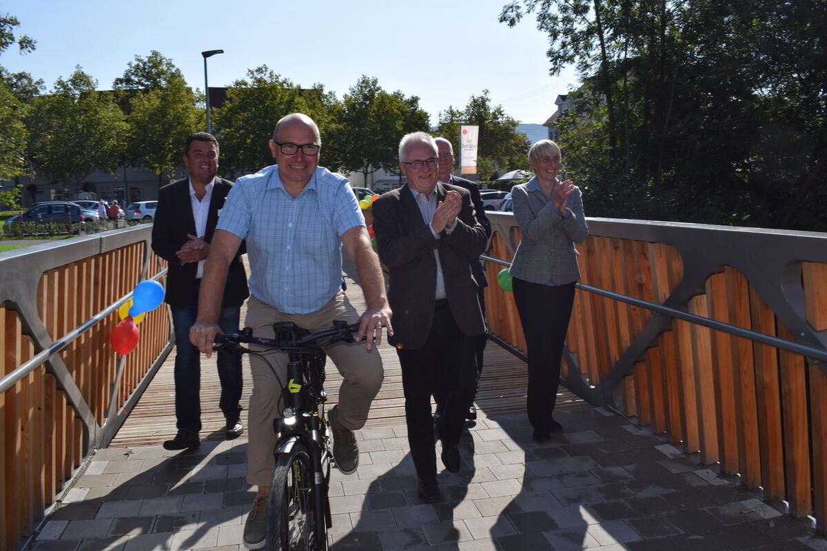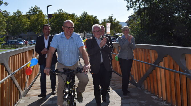 Vertreter der Stadtverwaltung sowie der Unternehmen Storopack und Kaufland weihen die Brücke am Adlergarten ein. FOTO: BÖRNER