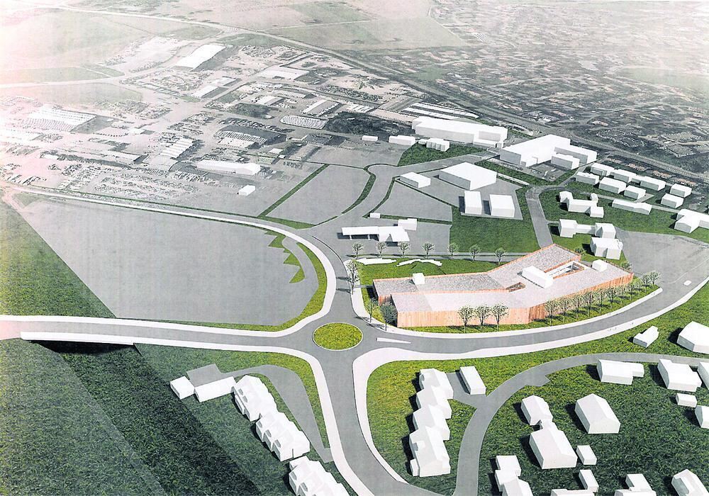 Das geplante Parkhaus an der Eichbergstraße passt sich nach jetzigem Stand mit einem Winkelbau dem Bogen der Straße an. GEA-REPRO: GRAFIK BLOCHER