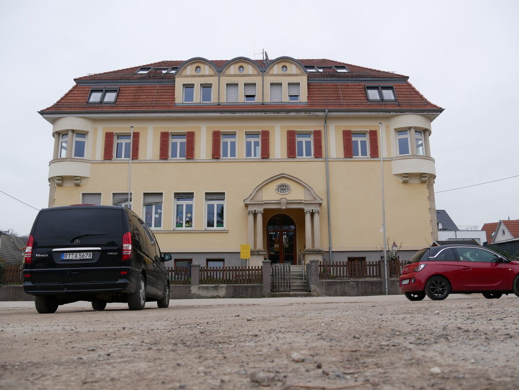 Das alte Schulhaus in der Eisenbahnstraße 5 in Wannweil. Der Gemeinderat hat jetzt über den gegenüberliegenden Parkplatz diskutiert. Hier könnte theoretisch auch ein Haus stehen. FOTO: FINK