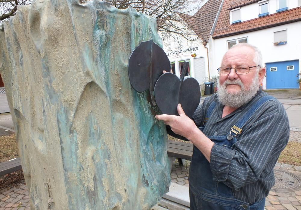 Am alten Lindenbrunnen: Kunstschmied Paul Zimmermann mit zwei der bereits geschmiedeten stilisierten Lindenblätter, die einmal, zu Bändern miteinander verbunden, die drei Stelen des neuen Lindenbrunnens in der Pliezhäuser Ortsmitte zieren werden.